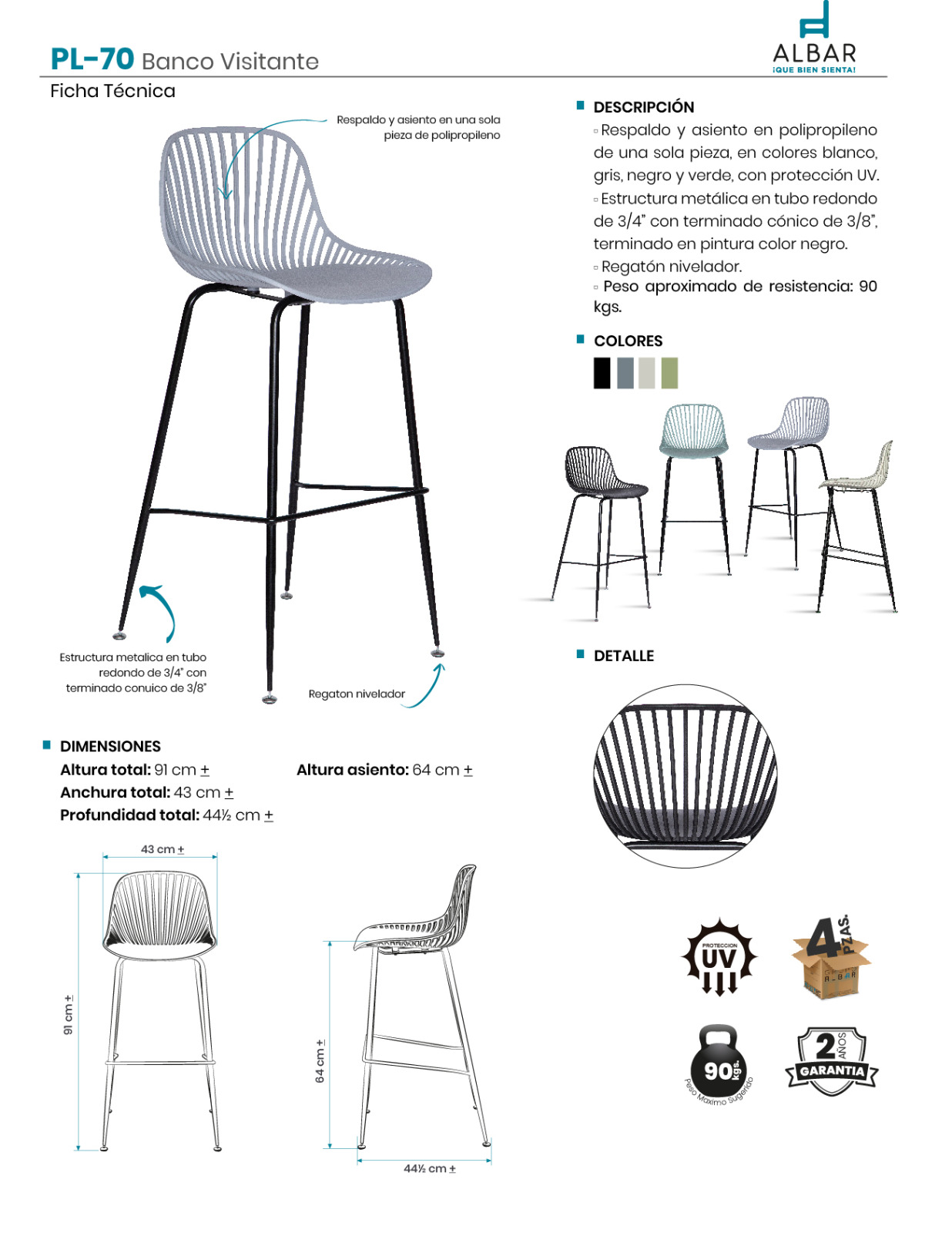 BANCO ALTO PL-70 MD (CAJA 4 PZAS) – Rayess Mobiliario
