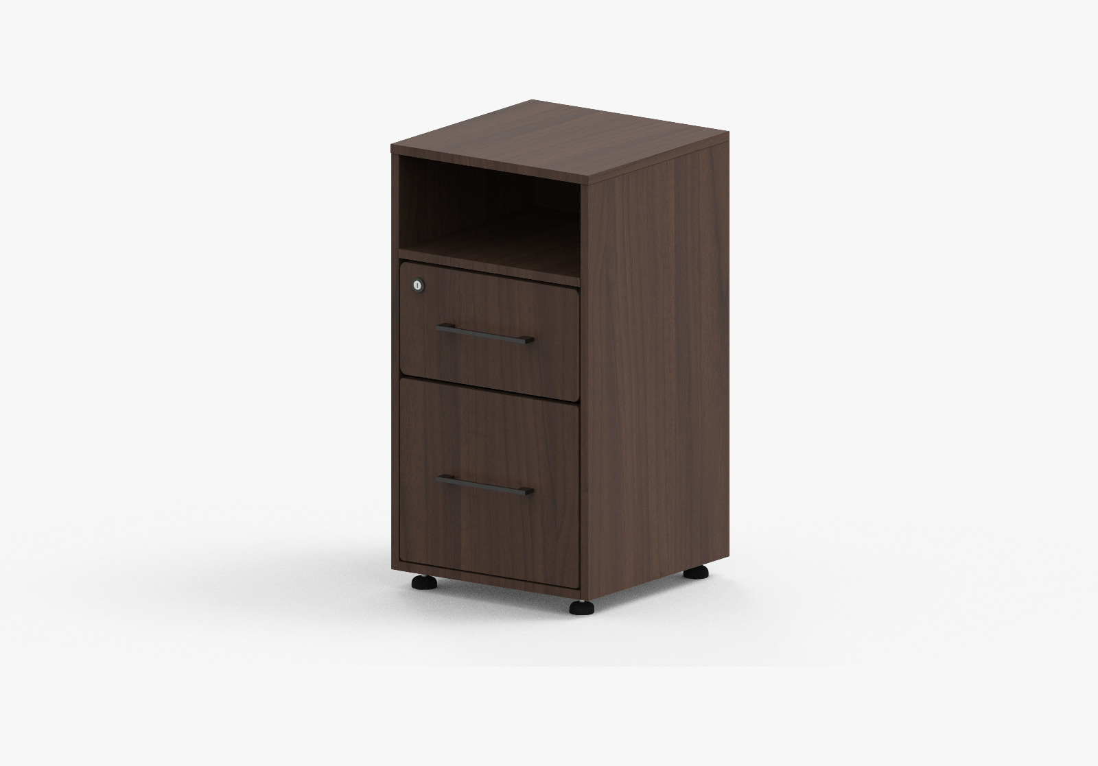 Archivero bajo cubierta fabricado en melamina de 16 mm. y canto rígido de PVC al mismo tono de la melamina, con 2 cajones (1 papelero y 1 archivo), frente del mismo tono del archivero y cajones en color negro en melamina de 12 mm., chapa de seguridad.