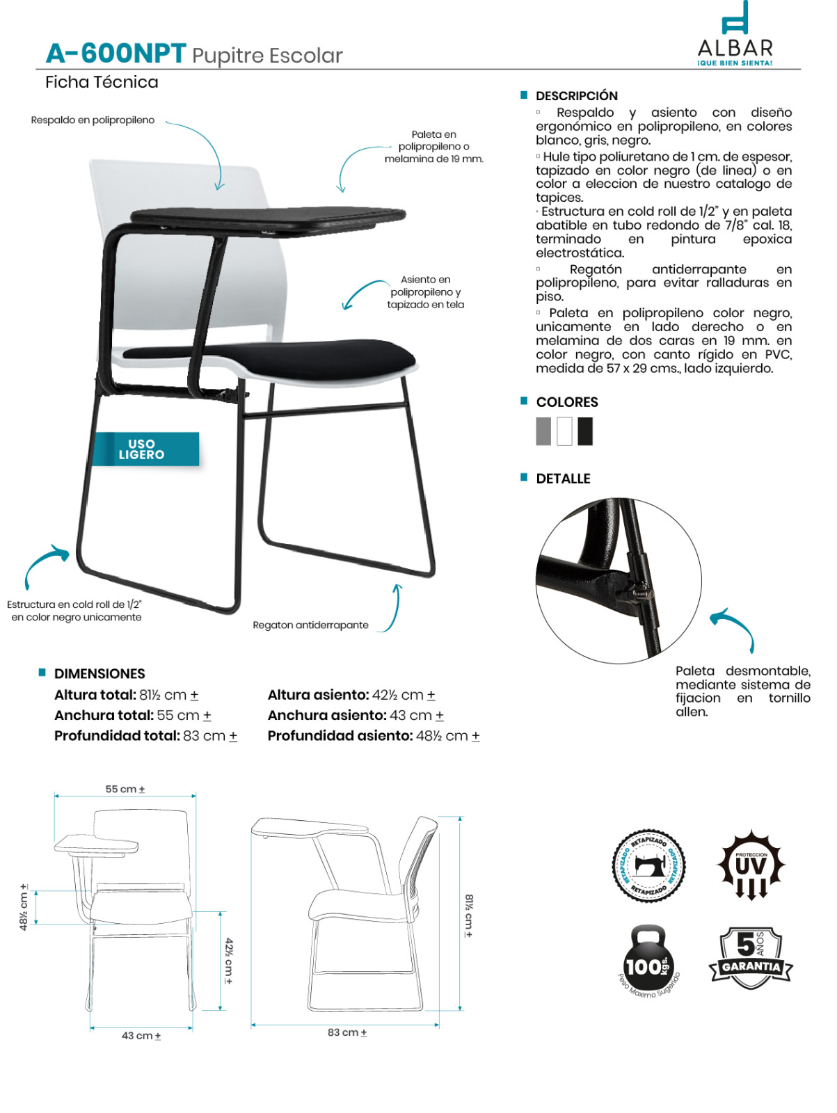 Respaldo y asiento con diseño ergonómico en polipropileno, en colores blanco, gris, negro, con hule tipo poliuretano de 1 cm. de espesor, tapizado en color negro (de linea) o en color a eleccion de nuestro catalogo de tapices, estructura en cold roll de 1/2” y en paleta abatible en tubo redondo de 7/8” cal. 18, terminado en pintura epoxica electrostática, regatón antiderrapante en polipropileno, para evitar ralladuras en piso, paleta en polipropileno color negro, unicamente en lado derecho o en melamina de dos caras en 19 mm. en color negro, con canto rígido en PVC, medida de 57 x 29 cms., lado izquierdo.