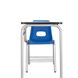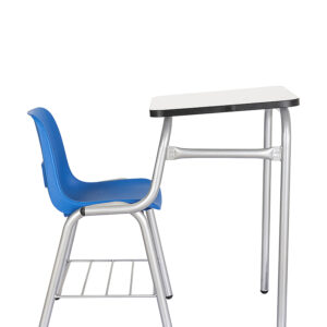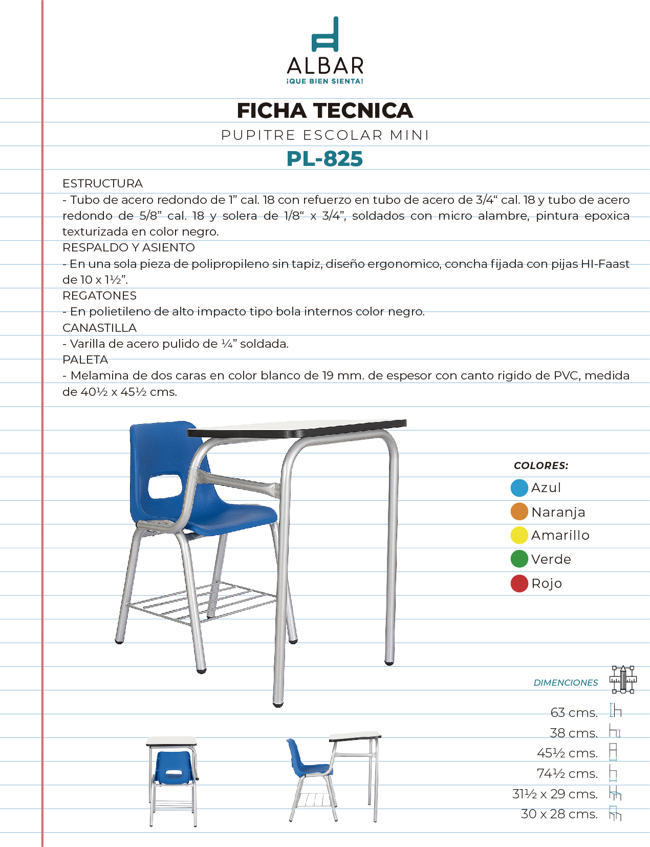 Estructura en tubo de acero redondo de 1” cal. 18 con refuerzo en tubo de acero de 3/4“ cal. 18 y tubo de acero redondo de 5/8” cal. 18 y solera de 1/8“ x 3/4”, soldados con micro alambre, pintura epoxica texturizada en color negro, respaldo y asiento en una sola pieza de polipropileno sin tapiz, diseño ergonomico, concha fijada con pijas HI-Faast de 10 x 1½”, canastilla en varilla de acero pulido de ¼” soldada, paleta en melamina de dos caras en color blanco de 19 mm. de espesor con canto rigido de PVC, medida de 40½ x 45½ cms.