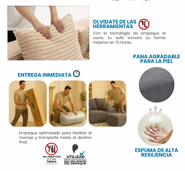 Con la tecnología de empaque al vacío, tu sofá tomara su forma máximo en 72 horas.