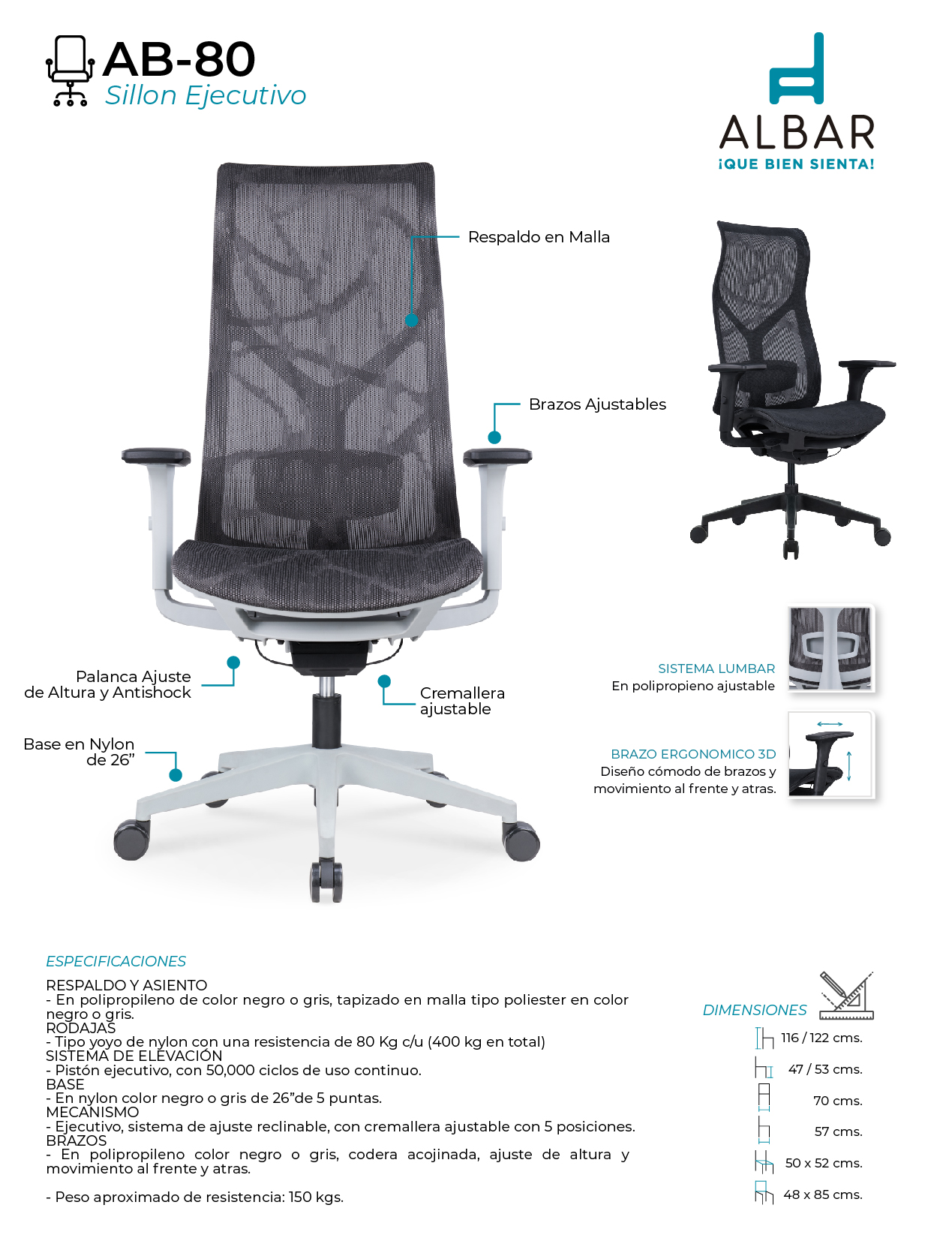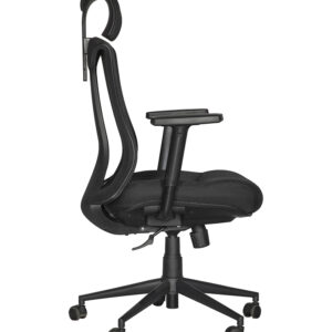 Respaldo y asiento en polipropileno de color negro o gris, tapizado en malla tipo poliester en color negro o gris, pistón ejecutivo, base en nylon color negro o gris de 26”de 5 puntas, mecanismo ejecutivo, sistema de ajuste reclinable, con cremallera ajustable con 5 posiciones, brazos en polipropileno color negro o gris, codera acojinada, ajuste de altura y movimiento al frente y atras.