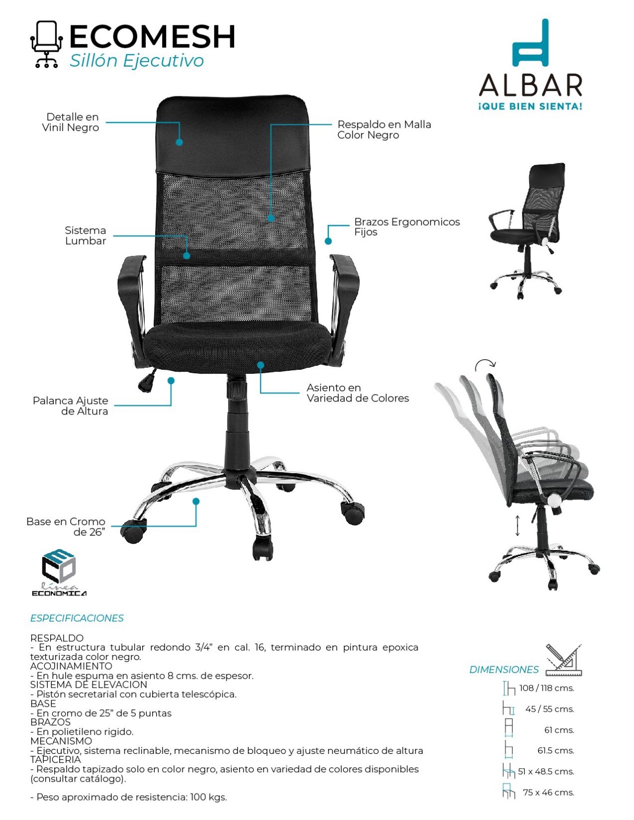 Respaldo en estructura tubular redondo 3/4” en cal. 16, terminado en pintura epoxica texturizada color negro, hule espuma en asiento 8 cms. de espesor, pistón secretarial, base cromo de 24” de 5 puntas, brazos en polietileno rigido, mecanismo ejecutivo, sistema reclinable, mecanismo de bloqueo y ajuste neumático de altura, respaldo tapizado solo en color negro y asiento en variedad de colores disponibles