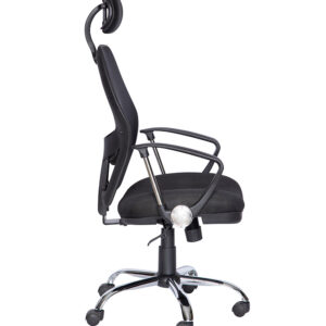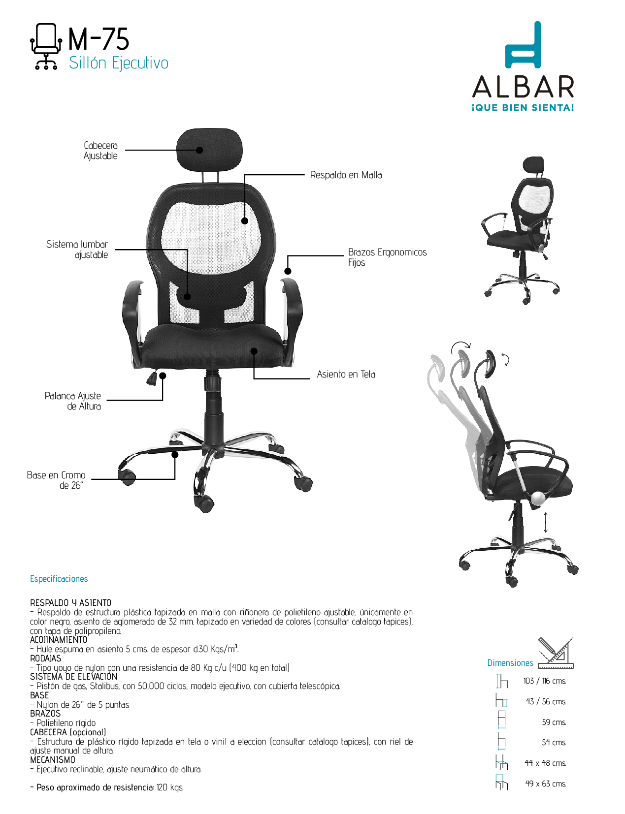 Respaldo de estructura plástica tapizada en malla con riñonera de polietileno ajustable, únicamente en color negro, asiento de aglomerado de 32 mm. tapizado en variedad de colores (consultar catalogo tapices), con tapa de polipropileno, hule espuma en asiento 5 cms. de espesor d.30 Kgs/m³, pistón ejecutivo, con cubierta telescópica, base en nylon de 24″ de 5 puntas, brazos en polietileno rÃgido, cabecera en estructura de plástico rÃgido tapizada en tela o vinil a eleccion (consultar catalogo tapices), con riel de ajuste manual de altura, mecanismo ejecutivo reclinable, ajuste neumático de altura.