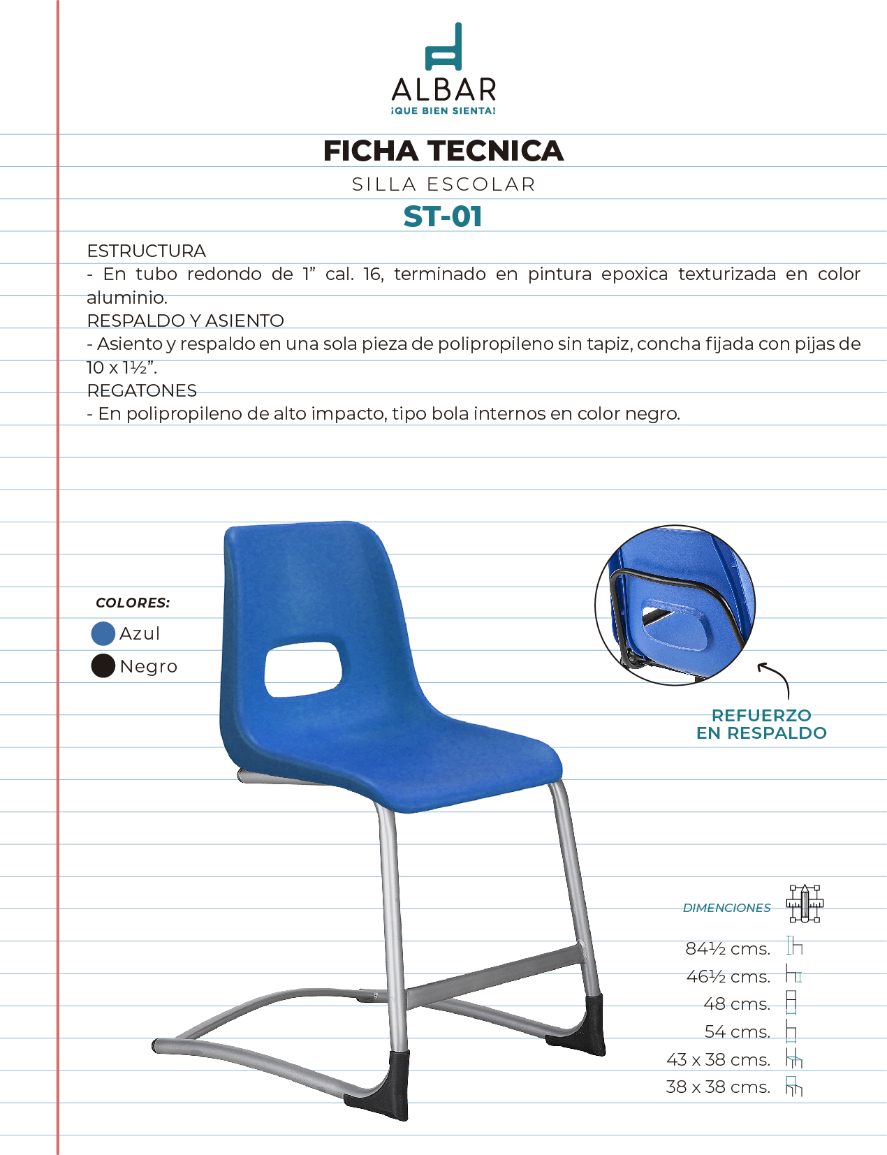 Estructura tubo redondo de 1” cal. 18, pintura epoxica texturizada, color aluminio, concha de polipropileno en colores negro y azul, regatón en polietileno de alto impacto tipo bola internos color negro, canastilla en acero pulido de 1/4” soldada.