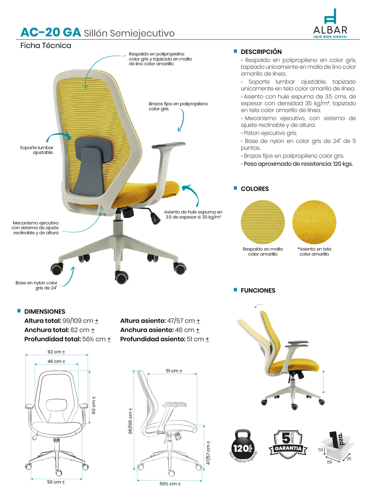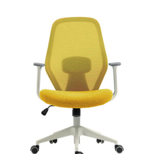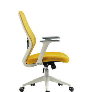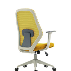 Respaldo en polipropileno en color gris, tapizado unicemente en malla de lino color amarillo de línea, soporte lumbar ajustable, tapizado unicemente en tela color amarillo de línea, asiento con hule espuma de 3.5 cms. de espesor con densidad 35g/m3, tapizado unicemente en tela color amarillo de línea, mecanismo ejecutivo, con sistema de ajuste reclinable y de altura, piston ejecutivo gris, base de nylon en color gris de 24” de 5 puntas, brazos fijos en polipropileno color gris.