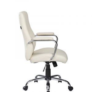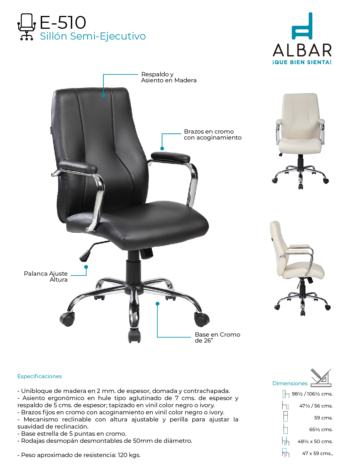 Unibloque de madera en 12 mm. de espesor, domada y contrachapada, asiento ergonómico en hule tipo aglutinado de 7 cms. de espesor y respaldo de 5 cms. de espesor; tapizado en vinil color negro o ivory, brazos fijos en cromo con acoginamiento en vinil color negro o ivory, mecanismo reclinable con altura ajustable y perilla para ajustar la suavidad de reclinación, base estrella de 5 puntas en cromo.