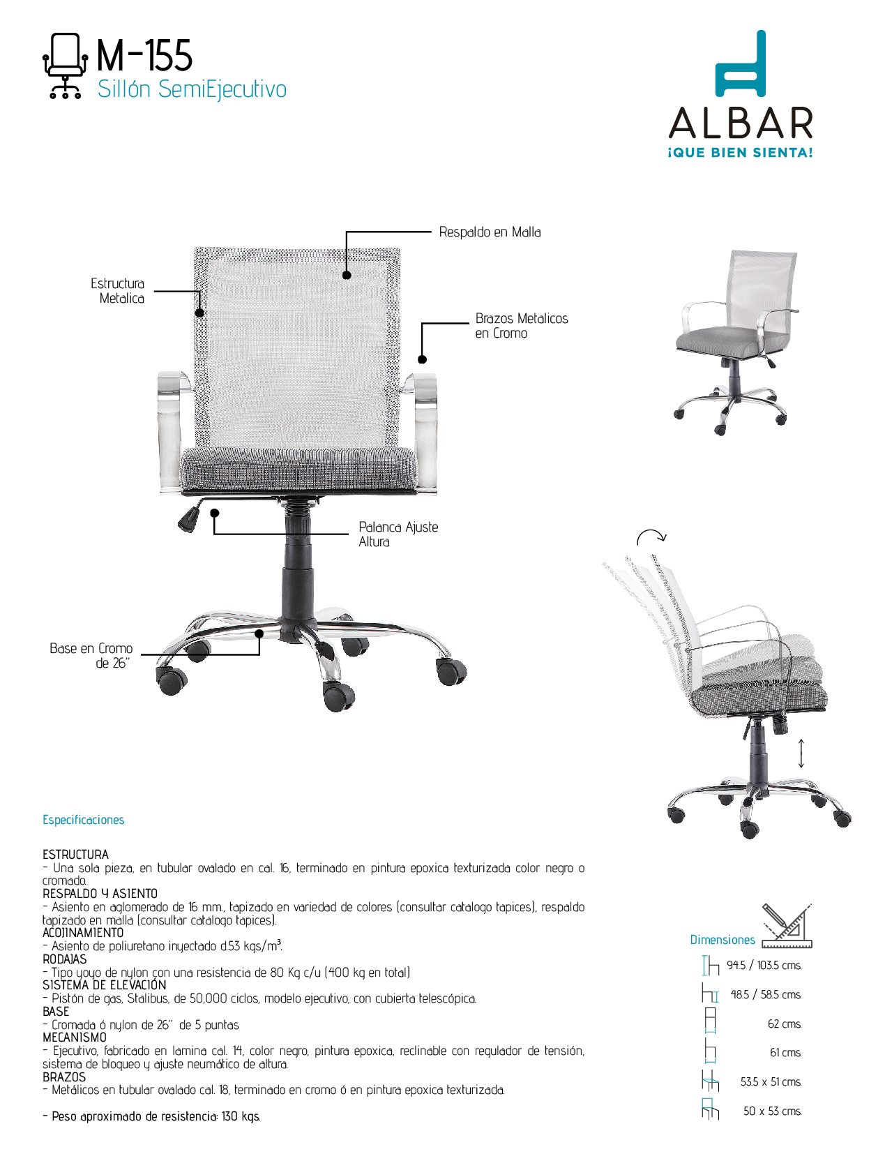 Estructura en una sola pieza, en tubular ovalado en cal. 16, terminado en pintura epoxica texturizada color negro o cromado, asiento en aglomerado de 16 mm., tapizado en variedad de colores (consultar catalogo tapices), respaldo tapizado en malla (consultar catalogo tapices), acoginamiento en asiento de poliuretano inyectado d.53 kgs/m³, pistón ejecutivo, con cubierta telescópica, base cromada ó nylon de 26” de 5 puntas, mecanismo ejecutivo, fabricado en lamina cal. 14, color negro, pintura epoxica, reclinable con regulador de tensión, sistema de bloqueo y ajuste neumático de altura, brazos metálicos en tubular ovalado cal. 18, terminado en cromo ó en pintura epoxica texturizada.