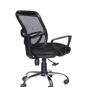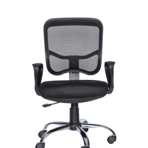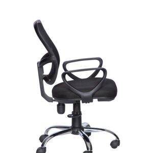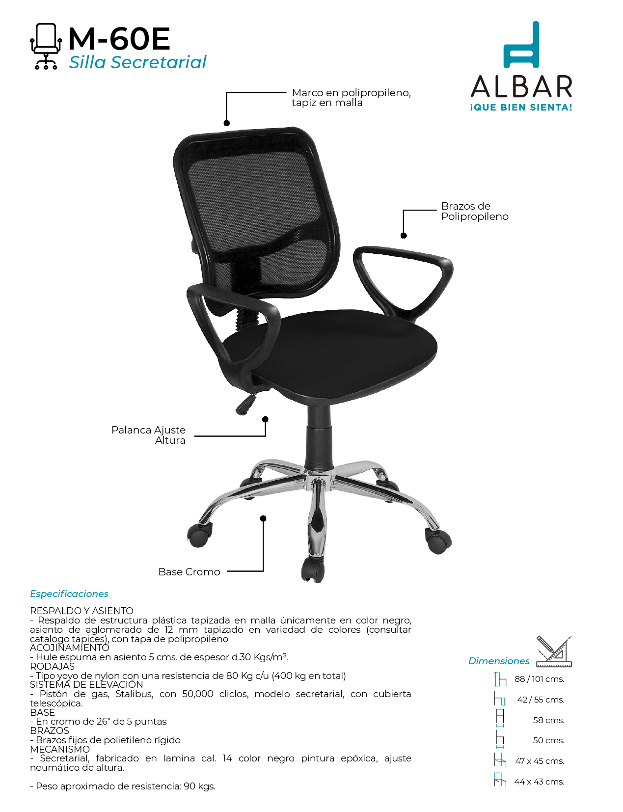 Respaldo de estructura plástica tapizada en malla únicamente en color negro, asiento de aglomerado de 12 mm tapizado en variedad de colores (consultar catalogo tapices), con tapa de polipropileno, hule espuma en asiento 5 cms. de espesor d.30 Kgs/m³, pistón secretarial, con cubierta telescópica, base cromada de 26″ de 5 puntas, brazos fijos de polietileno rígido, mecanismo secretarial, ajuste neumático de altura.