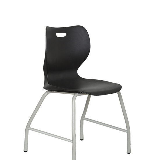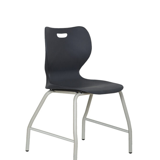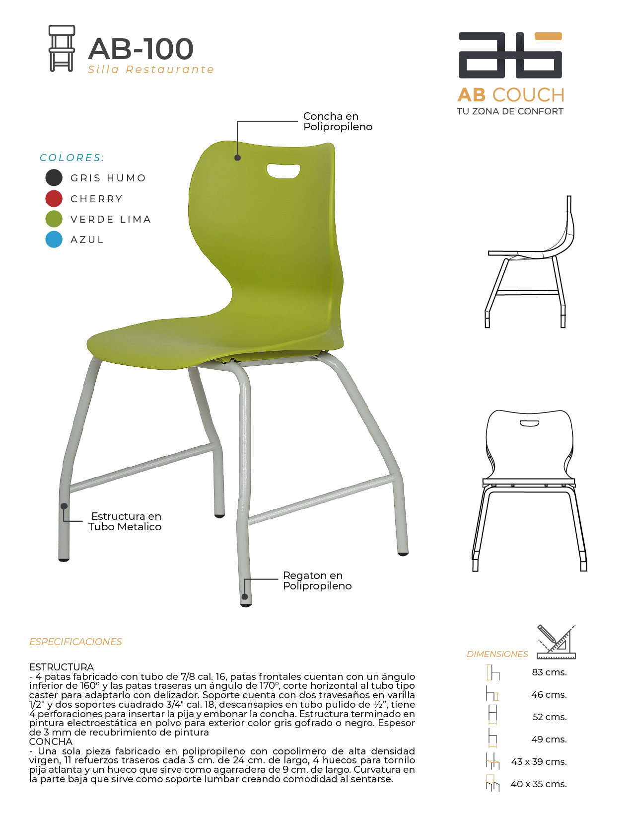 Estructura de 4 patas fabricado con tubo de 7/8 cal. 16, patas frontales cuentan con un ángulo inferior de 160° y las patas traseras un ángulo de 170°, corte horizontal al tubo tipo caster para adaptarlo con delizador o rodajas. Soporte cuenta con dos travesaños en varilla 1/2″ y dos soportes cuadrado 3/4″ cal. 18, tiene 4 perforaciones para insertar la pija y embonar la concha. Estructura terminado en pintura electroestática en polvo para exterior color gris gofrado o negro. Espesor de 3 mm de recubrimiento de pintura, concha en una sola pieza fabricado en polipropileno con copolimero de alta densidad virgen, 11 refuerzos traseros cada 3 cm. de 24 cm. de largo, 4 huecos para tornilo pija atlanta y un hueco que sirve como agarradera de 9 cm. de largo. Curvatura en la parte baja que sirve como soporte lumbar creando comodidad al sentarse.