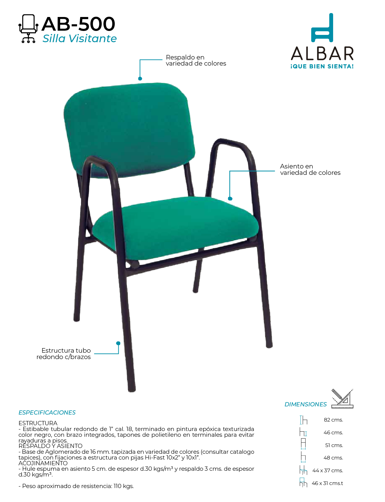 Estructura estibable en tubular redondo de 1” cal. 18, terminado en pintura epóxica texturizada color negro, con brazo integrados, tapones de polietileno en terminales para evitar rayaduras a pisos, base de aglomerado de 16mm., tapizada en variedad de colores (consultar catalogo tapices), con fijaciones a estructura con pijas Hi-Fast 10×2” y 10×1”, hule espuma en asiento 5 cm. de espesor d.30 kgs/m³ y respaldo 3 cms. de espesor d.30 kgs/m³.